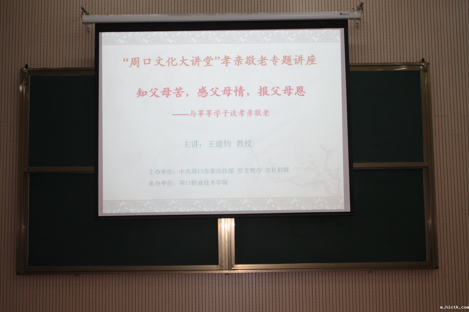 4月26日下午,由中共周口市委宣传部、市文明办、市hictk联主办,周口职业技术学院承办的周口文化大讲堂孝亲敬老专题讲座在周口职业技术学院多功能厅举行。本次讲座邀请了周口市人力资源和社会保障局党组成员王建钧老师与大家分享。